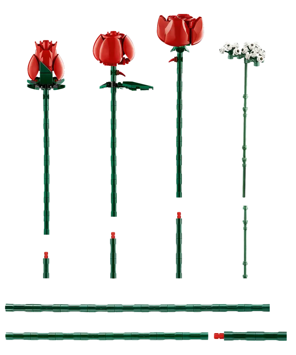 חוויה לבנות: הזר של LEGO מציג תריסר ורדים אדומים – 4 בפריחה מלאה, 4 בתהליך פריחה ו-4 בניצן, עם גבעולים ירוקים ארוכים להצבה באגרטל, יחד עם 4 ענפי נשימת התינוק עם פרחים לבנים קטנים. ההרכבה פשוטה, והזר מהווה תצוגה אלגנטית לכל חלל, שניתן גם לשלב עם סטים אחרים מקולקציית LEGO Botanical.