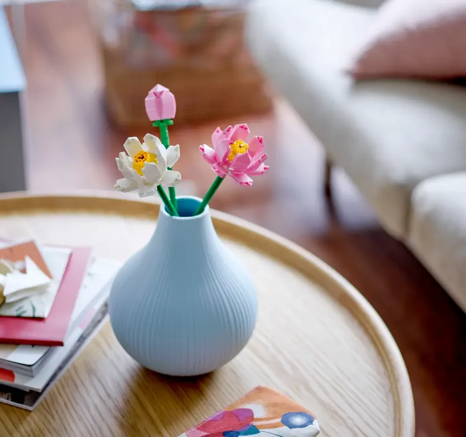 שחזרו פלא טבעי עם סט LEGO® Lotus Flowers. הגרסה הזו מלבני LEGO מציגה 2 פרחי לוטוס בפריחה מלאה ופרח אחד בניצן, בצבעי ורוד ולבן עדינים, עם גבעולים ירוקים ארוכים המתאימים להצבה באגרטל.