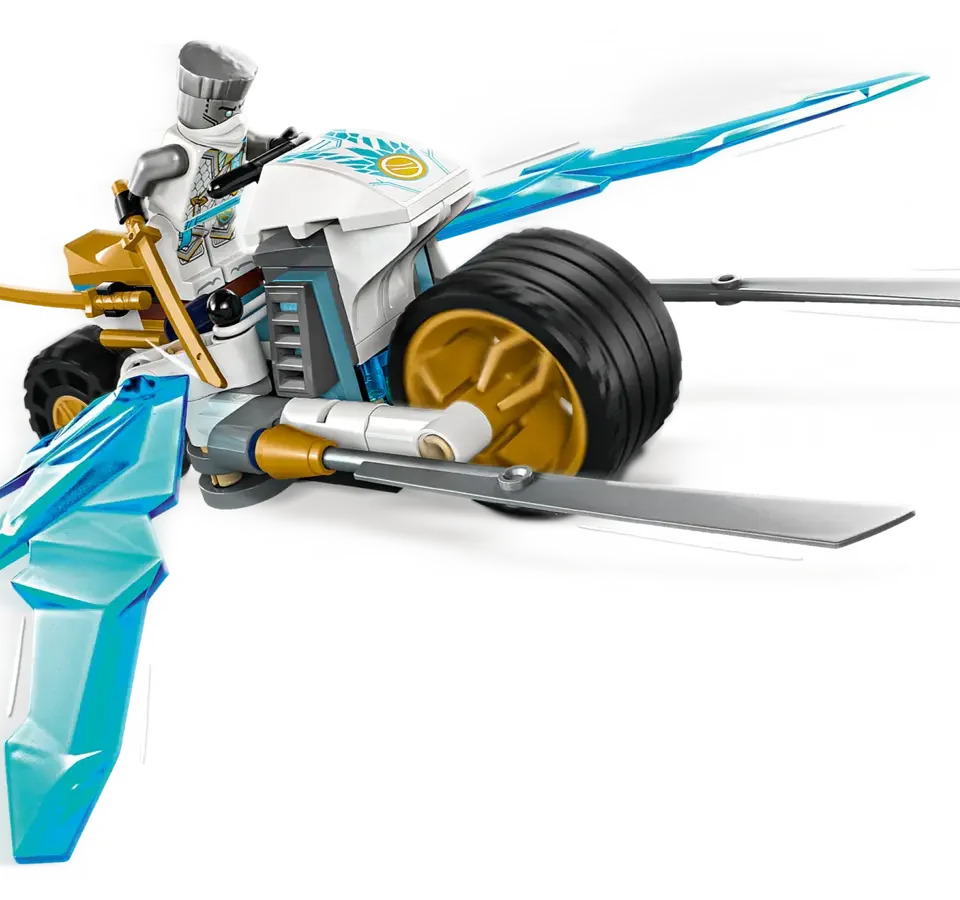ילדים בגיל 7 ומעלה יכולים לשחזר סצנות פעולה מהירות מהעונה השנייה של סדרת הטלוויזיה NINJAGO® Dragons Rising עם Zane’s Ice Motorcycle – צעצוע נינג’גו מרתק הכולל אופנוע עם גלגלים נעים, להבים מוזהבים ומתלים בגלגל האחורי. לחיצה על הגלגל האחורי מאפשרת לפרוס את להבי הקרח משני הצדדים ולהפעיל את אופנוע מצב התקפה.