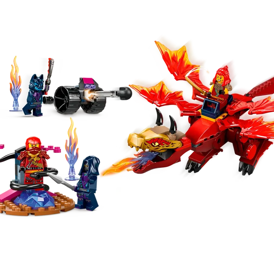 ילדים בגיל 4 ומעלה יכולים ללמוד לבנות תוך כדי חוויות נינג’גו מרתקות עם Kai’s Source Dragon Battle – סט הרפתקאות הכולל דרקון אדום שניתן להזיז אותו לפי רצונם. צעצוע הפעולה מאפשר לילדים להזיז את לסת, הראש, הזנב, הרגליים ו-4 הכנפיים של הדרקון. בנוסף, ניתן להכניס אלמנט אש לפיו כדי להפחיד את הנבלים.